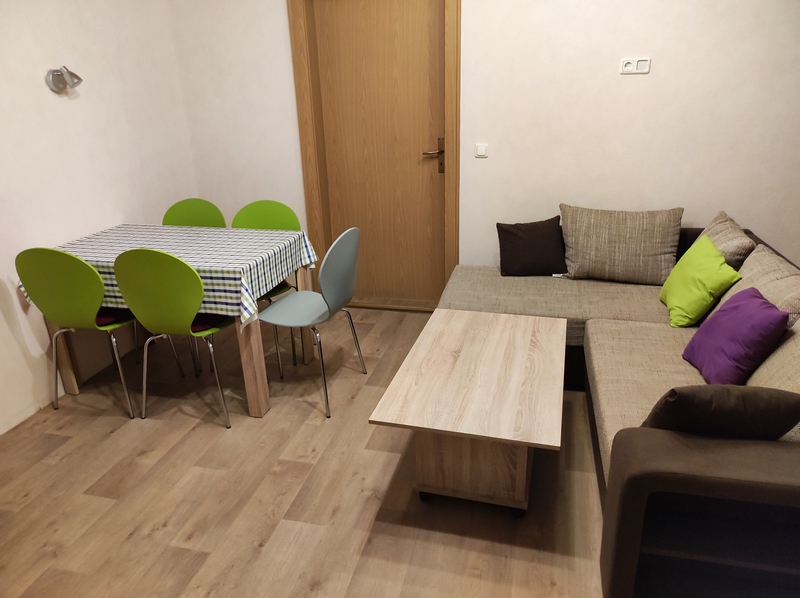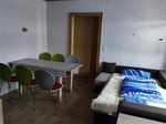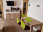 Wohnzimmer mit Essplatz und Schlafcouch.
